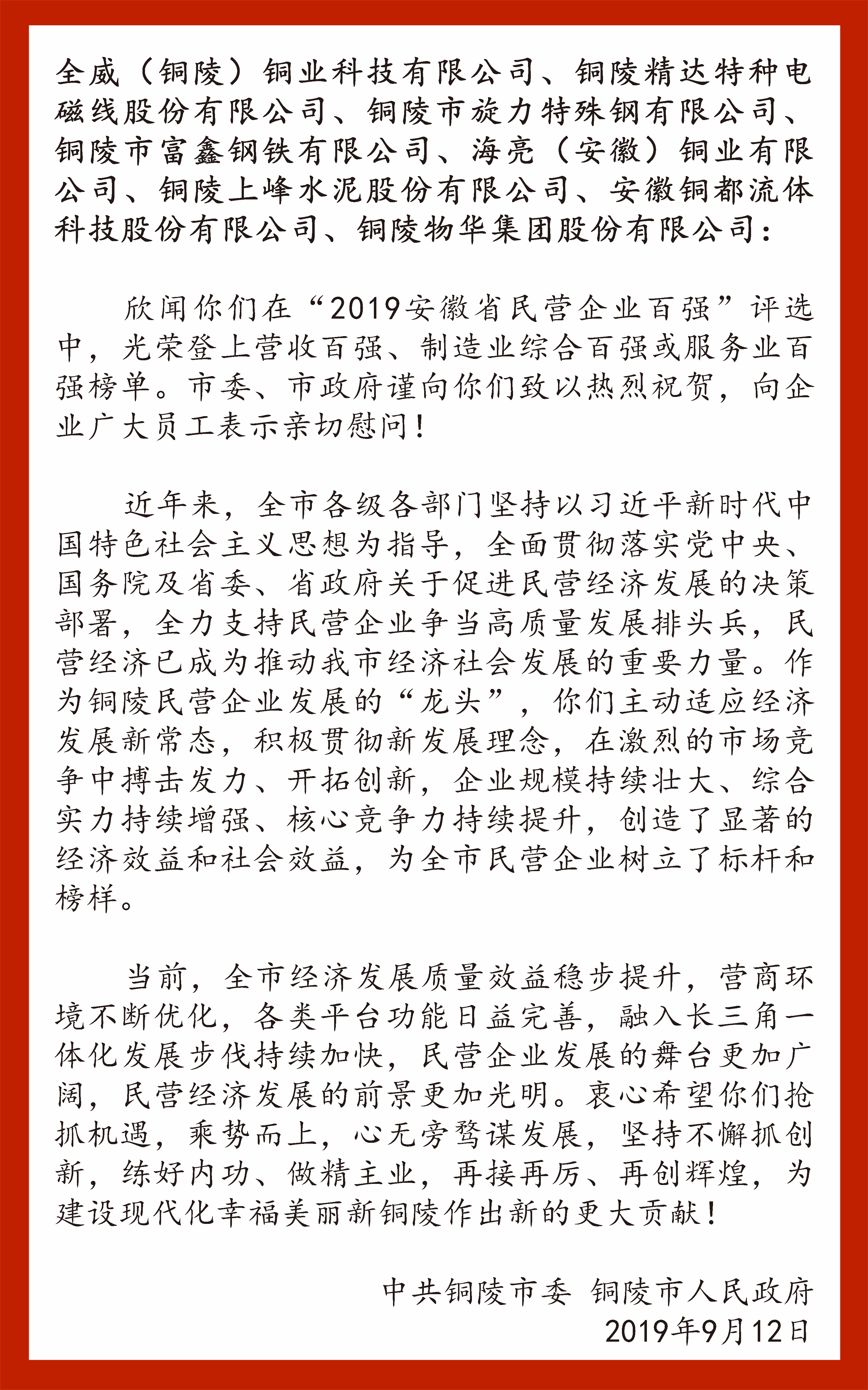 9月12日,在中秋佳節(jié)即將來(lái)臨之際,中共銅陵市委、銅陵市政府對(duì)銅都流體榮登“2019安徽省民營(yíng)企業(yè)百?gòu)?qiáng)”榜單致以熱烈祝賀,對(duì)企業(yè)員工表示親切慰問(wèn)!