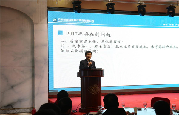 年會上,公司副總經理楊凌杰作2017年度營銷工作報告, 公司總經理趙小虎對2017年度工作作了全面總結,充分肯定了公司近三年來各項核心指標均實現(xiàn)兩位數增長的成績,指出了目前管理工作中存在的不足,提出了具體改進措施,并明確了2018年核心經營目標。公司董事長楊成結合行業(yè)及公司當前發(fā)展趨勢,從公司長遠發(fā)展、做大做強戰(zhàn)略高度,深刻分析了銅都流體面臨嚴峻的挑戰(zhàn)形勢,并指明企業(yè)的發(fā)展策略以及發(fā)展措施,并號召全體員工不忘初心,繼續(xù)發(fā)力,使銅都流體新年再上新臺階。