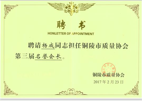 2017年2月末市質(zhì)量協(xié)會(huì)聘請(qǐng)董事長楊成先生,擔(dān)任銅陵市質(zhì)量協(xié)會(huì)第三屆名譽(yù)會(huì)