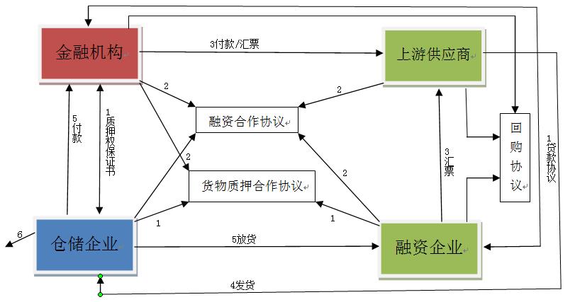 2.根據(jù)融資企業(yè)所提交的購(gòu)銷合同,金融機(jī)構(gòu)、融資企業(yè)與上游供貨商三方簽訂《貨物回購(gòu)協(xié)議》,金融機(jī)構(gòu)、融資企業(yè)、上游供貨商和倉(cāng)儲(chǔ)企業(yè)四方簽訂《融資合作協(xié)議》,融資企業(yè)向金融機(jī)構(gòu)繳納一定的保證金,金融機(jī)構(gòu)(主要指商業(yè)銀行)開出銀行承兌匯票,將銀行承兌匯票交由融資企業(yè)(此處并非一定是銀行匯票,也可以資金的形式等)。